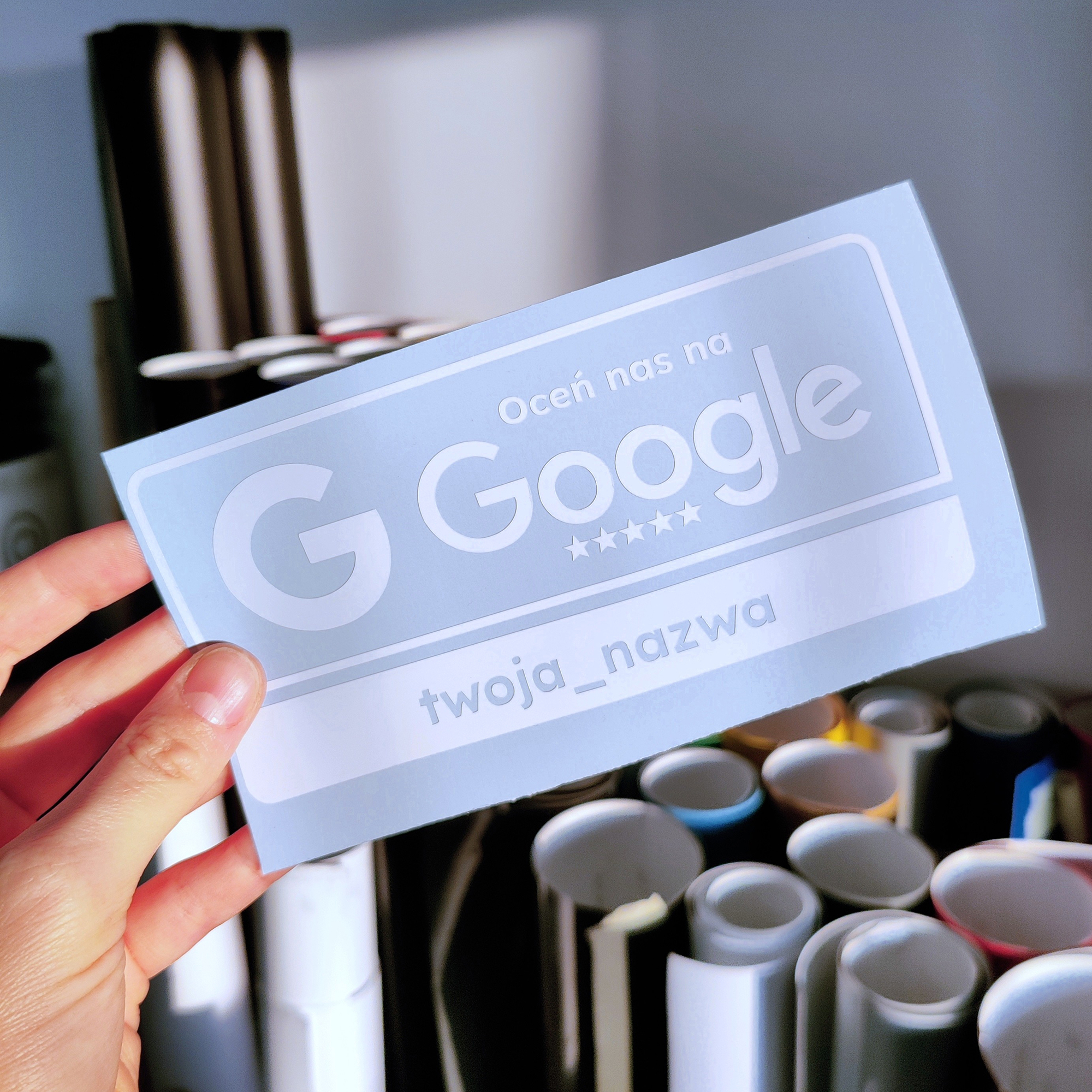 Naklejka Oceń nas na Google działa jak cicha reklama, łącząc przestrzeń offline z Twoją obecnością online.